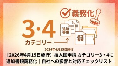 特定技能 【2026年4月15日施行】技人国申請 カテゴリー3・4に追加書類義務化|自社への影響と対応チェックリスト 2026年4月15日以降にカテゴリー3・4の企業が技人国(在留資格「技術・人文知識・国際業務」)の申請を行う場合、「所属機関代表者申告書」の提出が新たに義務化されます。外国人社員が対人業務に従事している場合は、さらにCEFR B2(JLPT... 2026.04.16 特定技能